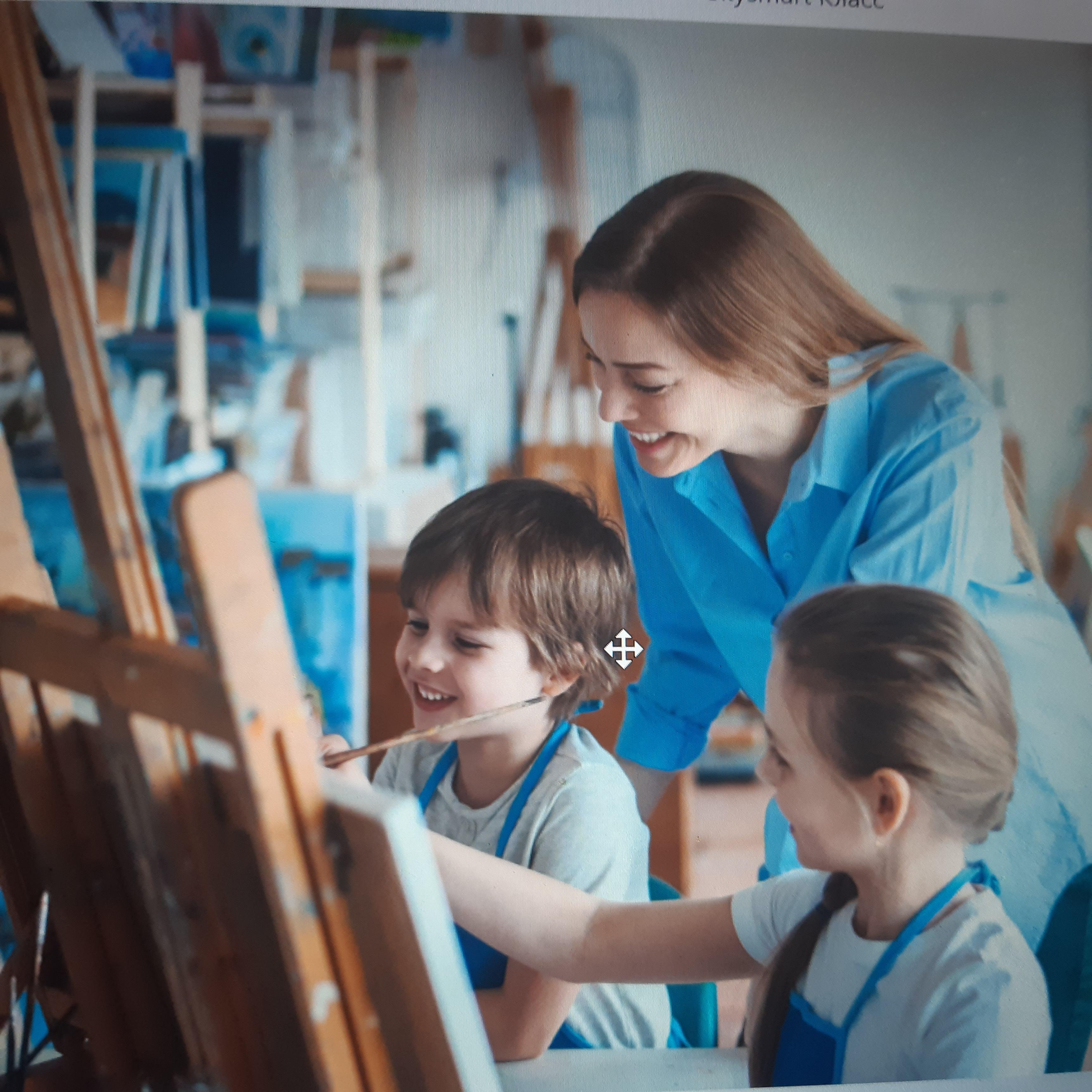 in the photo, there is a mother in the room with the children. she looks at how her son and daughter draw. she is wearing a blue shirt and dark blue jeans. I like this picture. I like her because she's cozy and family-friendly