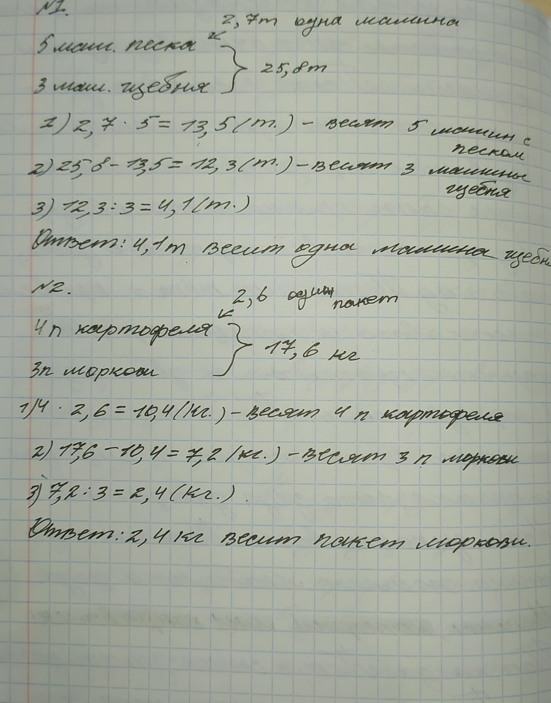 5 машин песка т 3 машины щебня имеют массу 25,8 т.Найдите массу одной машины щебня,если масса одной машины 2,7 т.
