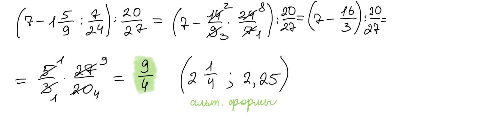 Вычислите: левая круглая скобка 7 минус 1 дробь: числитель: 5, знаменатель: 9 конец дроби : дробь: числитель: 7, знаменатель: 24 конец дроби правая круглая скобка : дробь: числитель: 20, знаменатель: 27 конец дроби . Запишите решение и ответ.