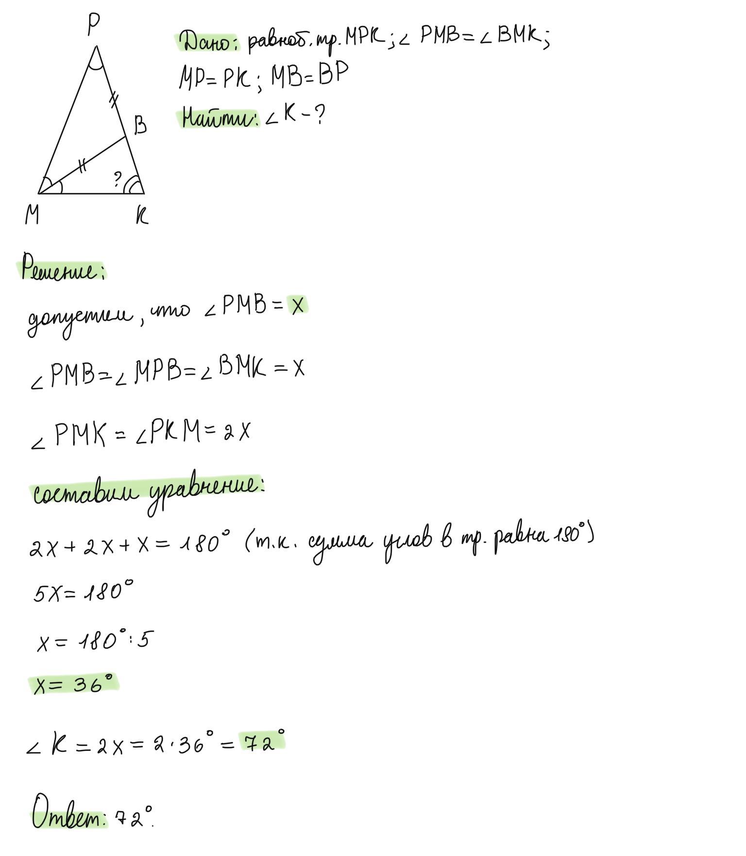 В равнобедренном треугольнике MPK с основанием MK провели биссектрису MB. Оказалось, что треугольник MPB- равнобедренный, причём MB=BP.