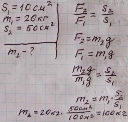 масою 20 кг. Площа більшого поршня 50 см². Вантаж якої маси потрібно покласти на