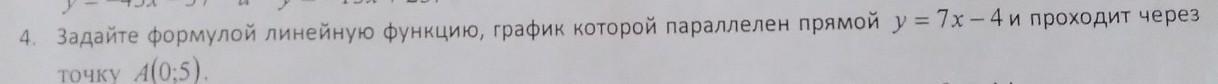 Графиком линейной функции у=7х-4 является прямая линия с угловым коэффициентом k=7 . Значит прямая, параллельная заданной прямой, будет иметь такой же угловой коэффициент k=7 и уравнение этой прямой будет иметь вид y=7x+b .