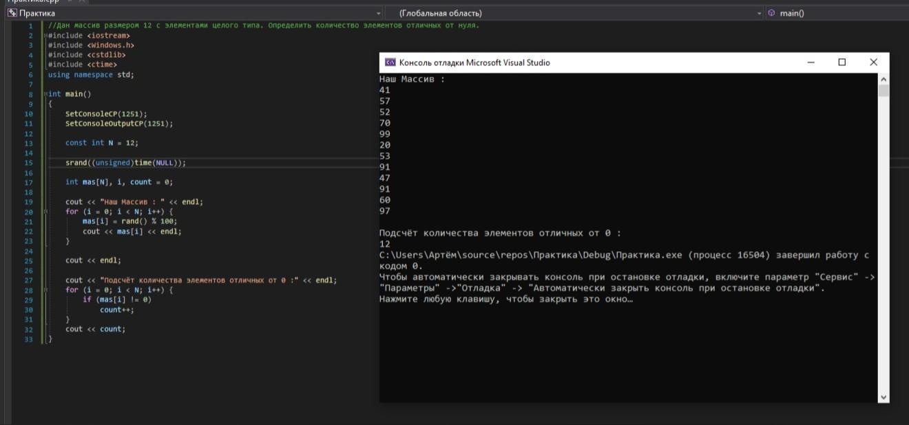 Дано масив розміром12 з елементами цілого типу. Визначити кількість елементів відмінних від нуля.