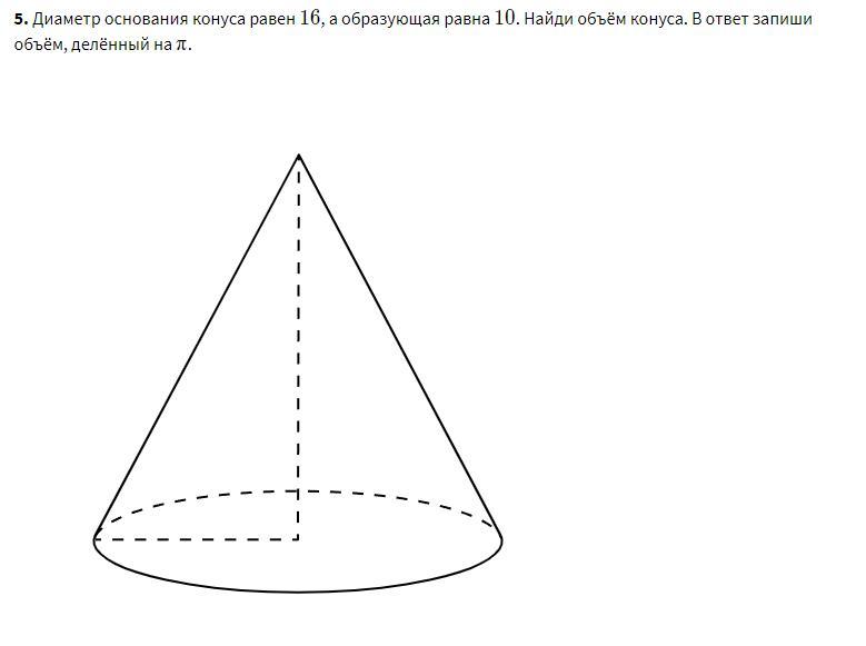 Диаметр основания конуса равен 16 , а образующая равна 10 . Найди объём конуса. В ответ запиши объём, делённый на π .