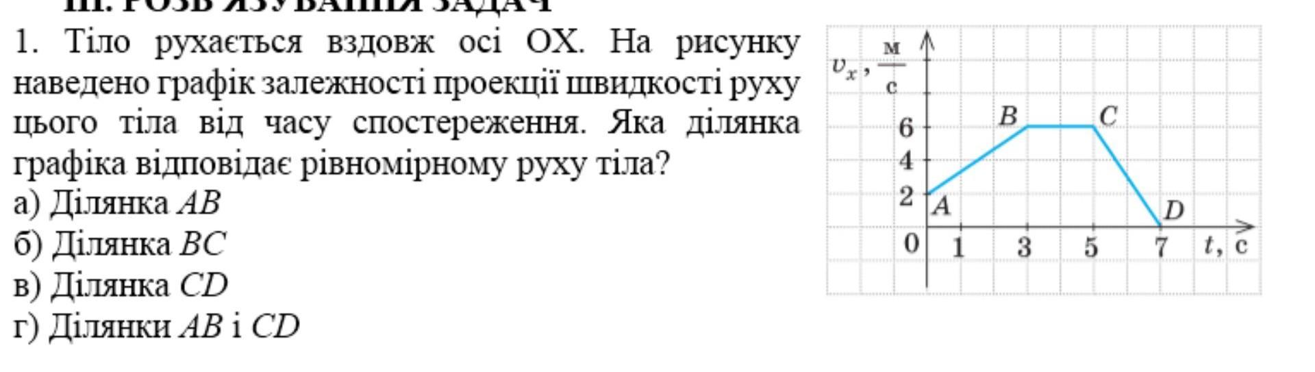 Тіло рухається вздовж осі ОХ. На рисунку наведено графік залежності проекції швидкості руху цього тіла від часу спостереження. Яка ділянка графіка відповідає рівномірному руху тіла?