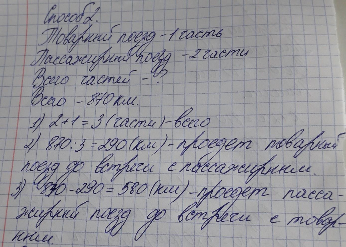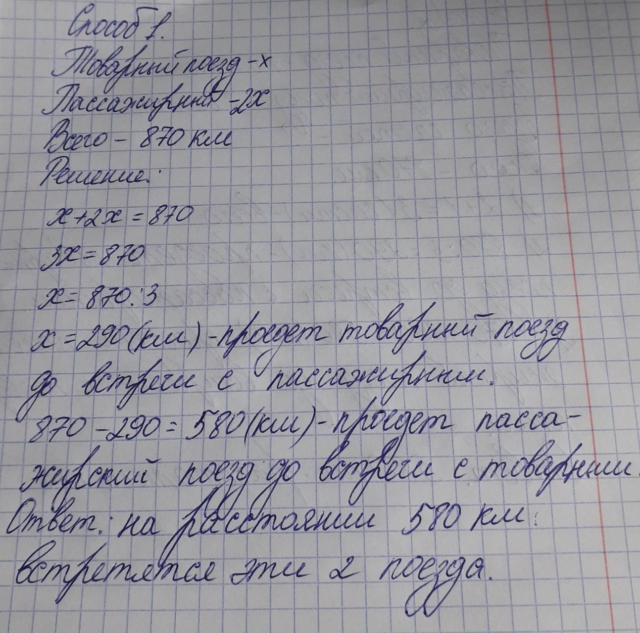 Реши задачу Одновременно навстречу друг другу Вышли два поезда: из Москвы : товарный, а из Санкт-Петербурга пассажирский. Скорость пассажирского поезда была в 2 раза больше, чем скорость товарного. На каком расстоянии от Москвы встретятся поезда, если считать, что расстояние между этими городами 870 км?