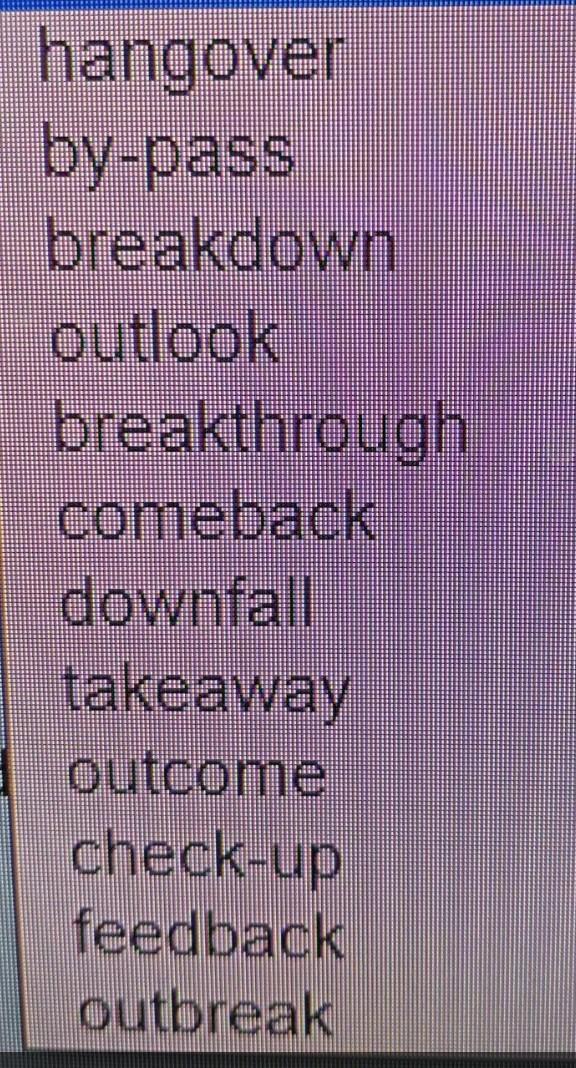 The ____breakdown_______ of communication between management and workers means the strike will continue. b. His career as a pop singer has suffered over the past few years, but now with a new album and a world tour, he's trying to make a______comeback_____. c. I had too much beer last night. Today I've got a …..hangover……d I go to the dentist twice a year for a __check-up________. e. The ___outcome_________of the election is that Labor has a majority of 90. f. There used to be so much traffic going through our town, but since the __by-pass______ was built we only have local traffic. g. The weather should be stable over the next few days, and the ____outlook______for the weekend is warm and sunny. h. There has been an __outbreak________of food poisoning as a result of people eating contaminated meat pies. i. There has been a significant _____breakthrough______in the search to find a cure for the common cold. j. Producers often ask their customers to complete questionnaires on their products, because they need to get _______feedback_____to see what the people think. k. “What's for supper?” “A Chinese ____takeaway________.” 1. He used to be a highly successful businessman, but he lost the lot. Greed was his __downfall_________.