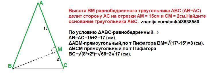 Высота ВМ равнобедренного треугольника АВС (АВ=АС) делит сторону АС на отрезки АМ = 15см и СМ = 2см.Найдите основание треугольника АВС.