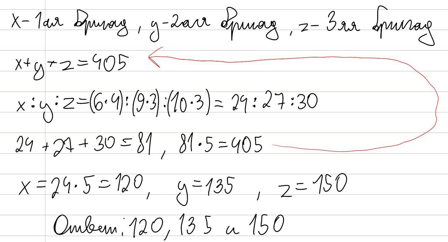 Три бригады рабочих получили за совместную работу 405 рублей. Первая бригада состояла из