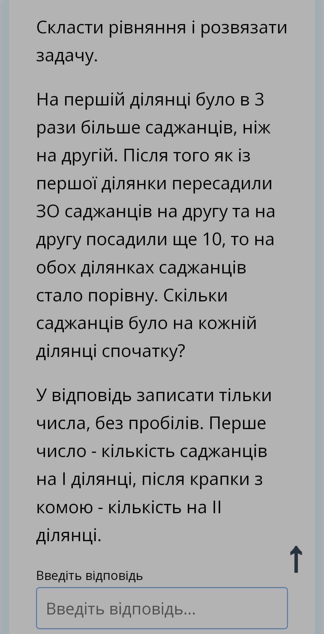 Хай буде х кількість саджанців на друге ділянці, тобто на перше 3х по умове. С першей ділянки пересадили 30 саджанців на другу, тобто отримуємо на першей 3х-30 , на друге х+30. Після того на друге ділянкі посадили ще 10 саджанців ми отримуємо рівність між першой ділянкі 3х-10 і друге х+30+10, тобто ми отримуємо рівняння