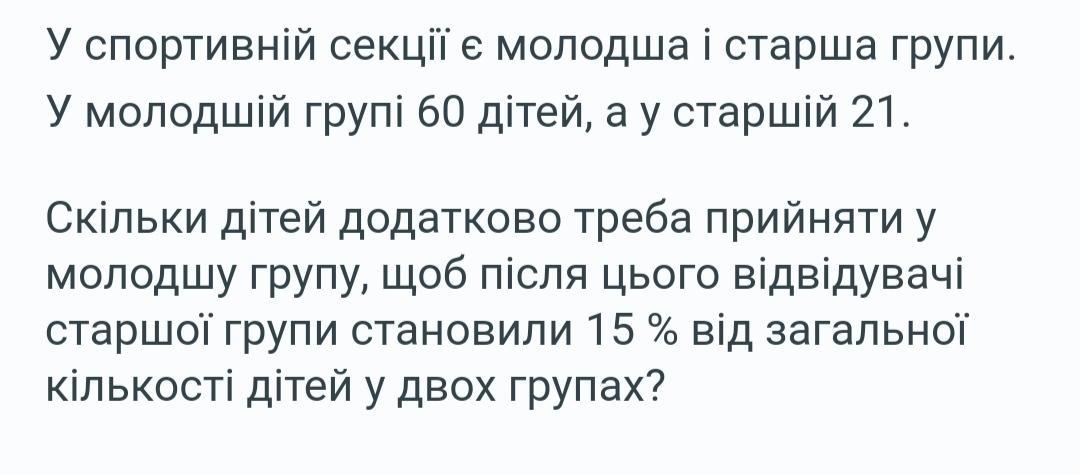 2.У спортивній секції є молодша і старша групи. У молодшій групі 60 дітей, а у старшій 21. Скільки дітей додатково треба прийняти у молодшу групу, щоб після цього відвідувачі старшої групи становили 15% від загальної кількості дітей у двох групах?
