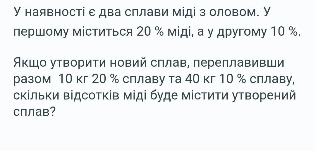 1. У наявності є два сплави міді з оловом. У першому міститься 20 % міді, а у другому 10 %. Якщо утворити новий сплав, переплавивши разом 10 кг 20 % сплаву та 40 кг 10 % сплаву, скільки відсотків міді буде містити утворений сплав?