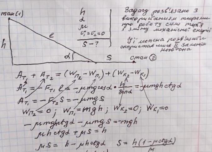 Тіло ковзає по похилій площині висотою h і кутом нахилу a до горизонту і далі рухається по горизонтальній ділянці шляху. Вважаючи коефіцієнт тертя постійним і рівним u , визначити відстань S , яку тіло пройде на горизонтальному шляху до повної зупинки.