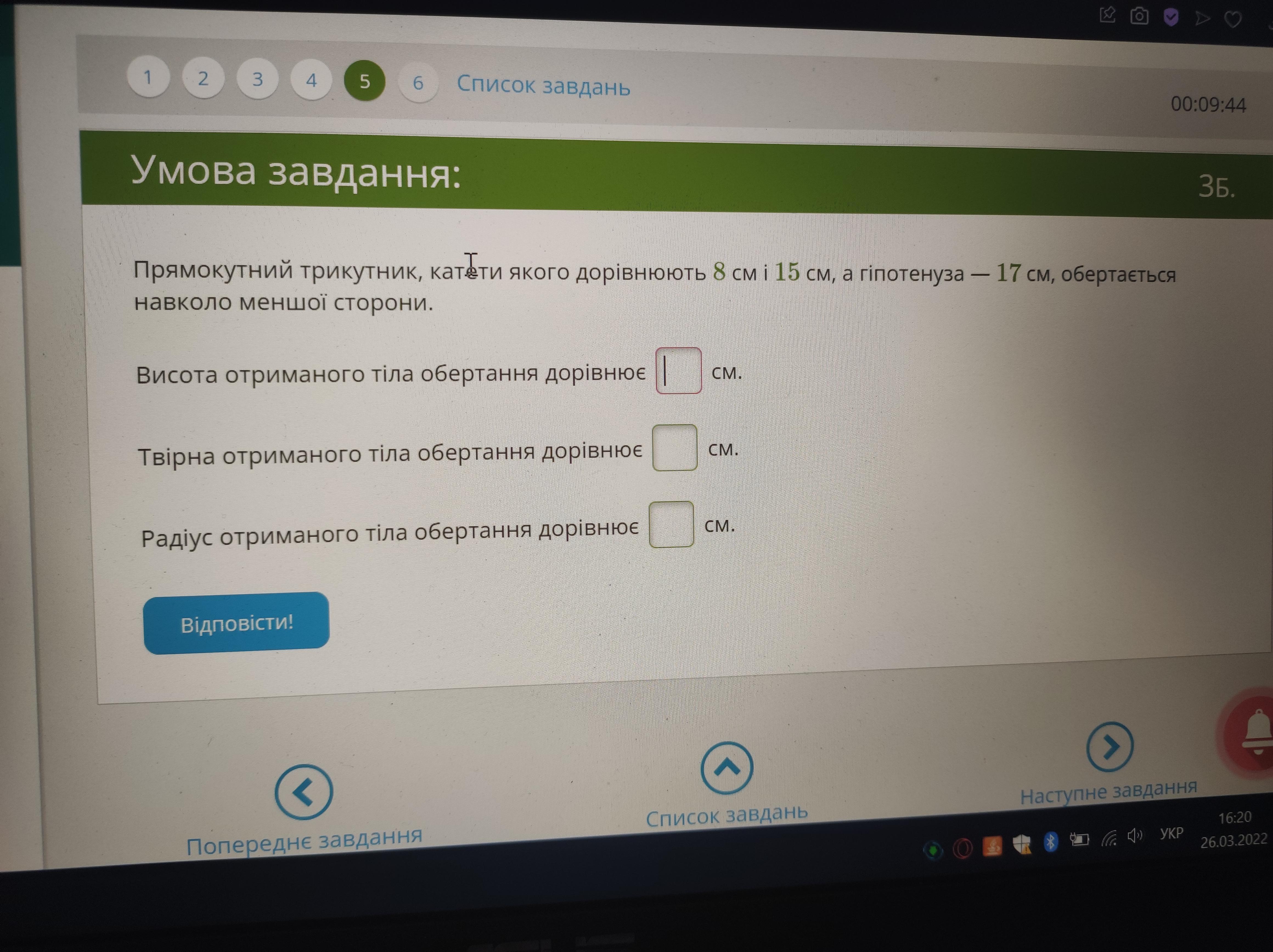 Радиус тела вращения равен большему катету, т.е. равен 15 СМ