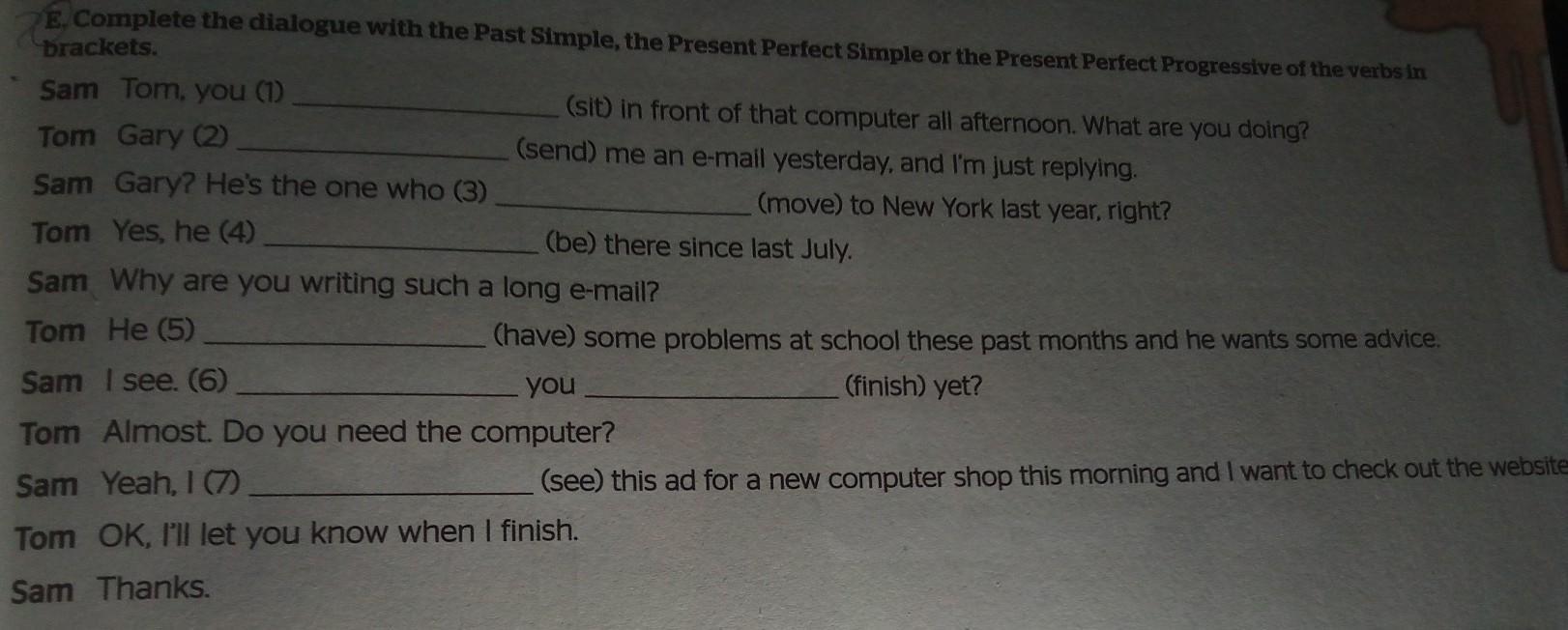 E. Complete the dialogue with the Past Simple, the Present Perfect Simple or the Present Perfect Progressive of the verbs in brackets.