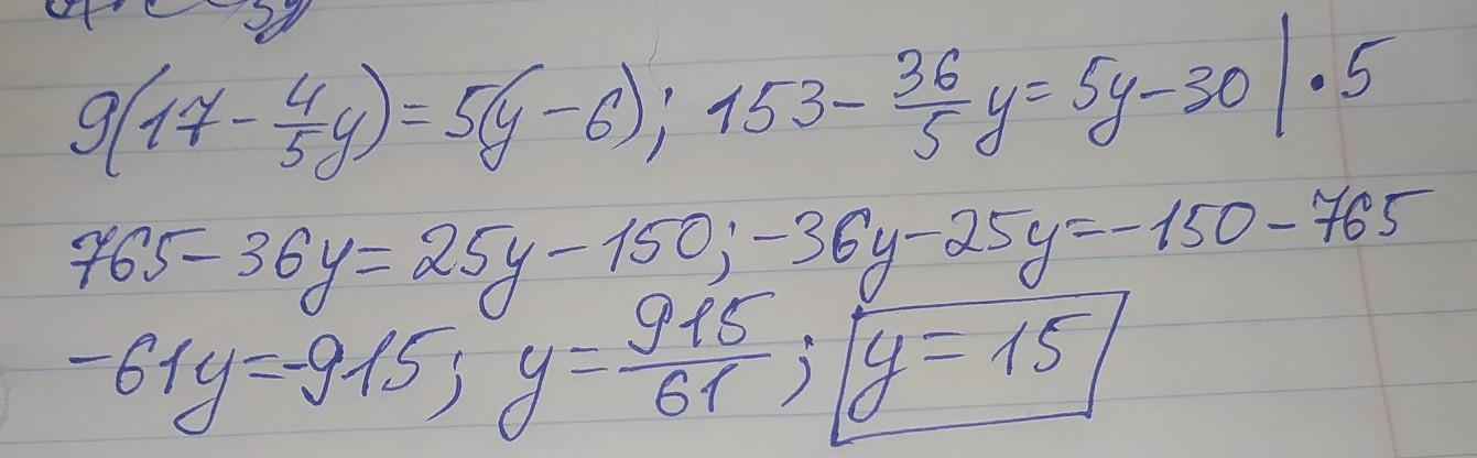 Помножте кожний доданок на множник і розкрийте дужки. 153-36/5y=5y-30. Помножте обидві частини рівняння на 5. 765-36y=25y-150. Перенесіть змінну з протилежним знаком у ліву частину. -36y-25y=-150-765. Зведіть подібні доданки. -61y=-915. Розділіть обидві частини рівняння на -61. y=15