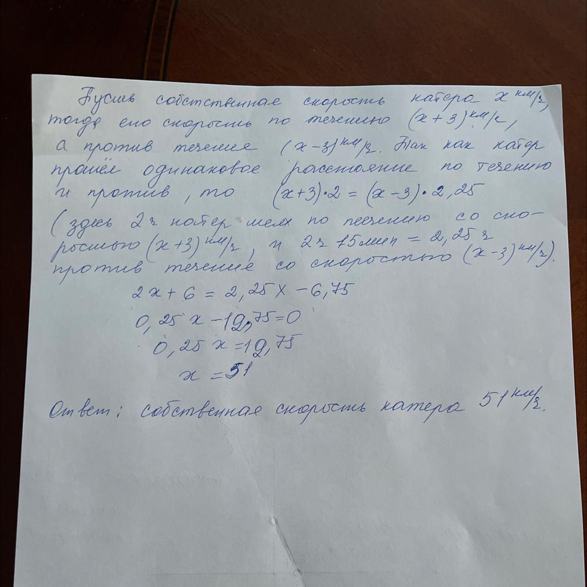 катер пройшов за течією річки за 2 год таку саму відстань, як і за 2 год 15 хв проти течії. знайдіть власну швидкість катера , якщо швидкість течії річки дорівнює 3 км/год