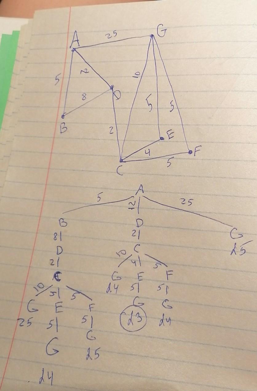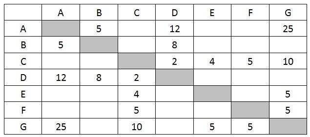 Между населёнными пунктами A, B, C, D, E, F, G построены дороги, протяжённость которых приведена в таблице. Отсутствие числа в таблице означает, что прямой дороги между пунктами нет.Определите длину кратчайшего пути между пунктами A и G (при условии, что передвигаться можно только по построенным дорогам).