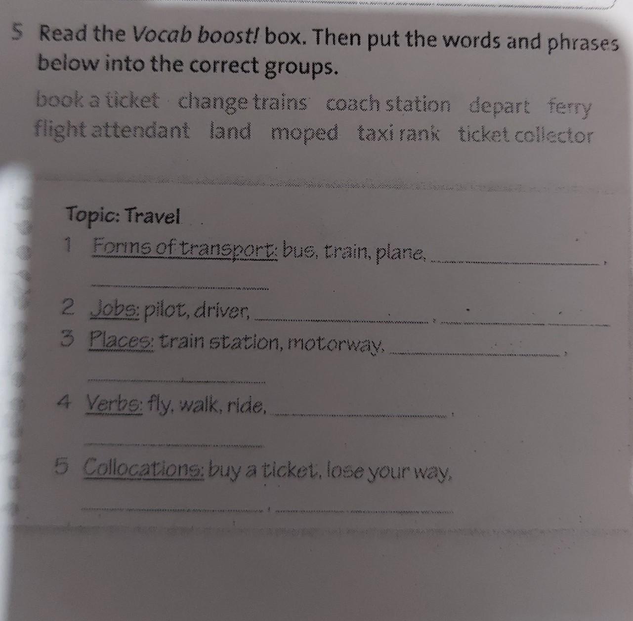 5 Read the Vocab boost box. Then put the words and phrases below into the correct groups. book a ticket change trains coach station depart ferry flight attendant land moped taxi rank ticket collector Topic: Travel 1 Forms of transport bus, train, plan 2 Joka pilot, driver 3 Places train station motorway 4 Verbo fly, walk ride, 5 Collocation, buy a ticket lose your way