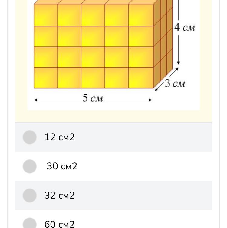объём параллелепипеда находится так: длина умножить на высоту и умножить на ширину. В нашем случае 5*4*3 = 60см3
