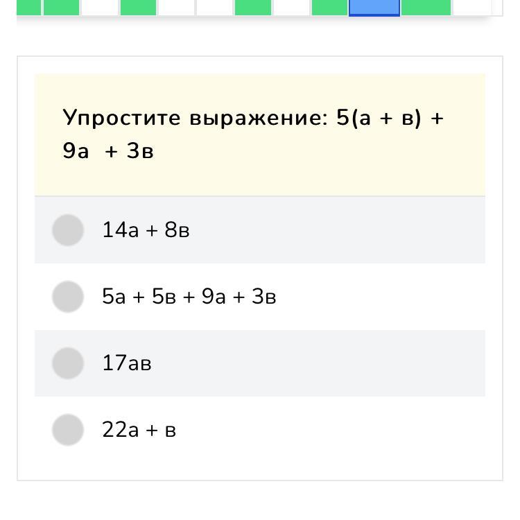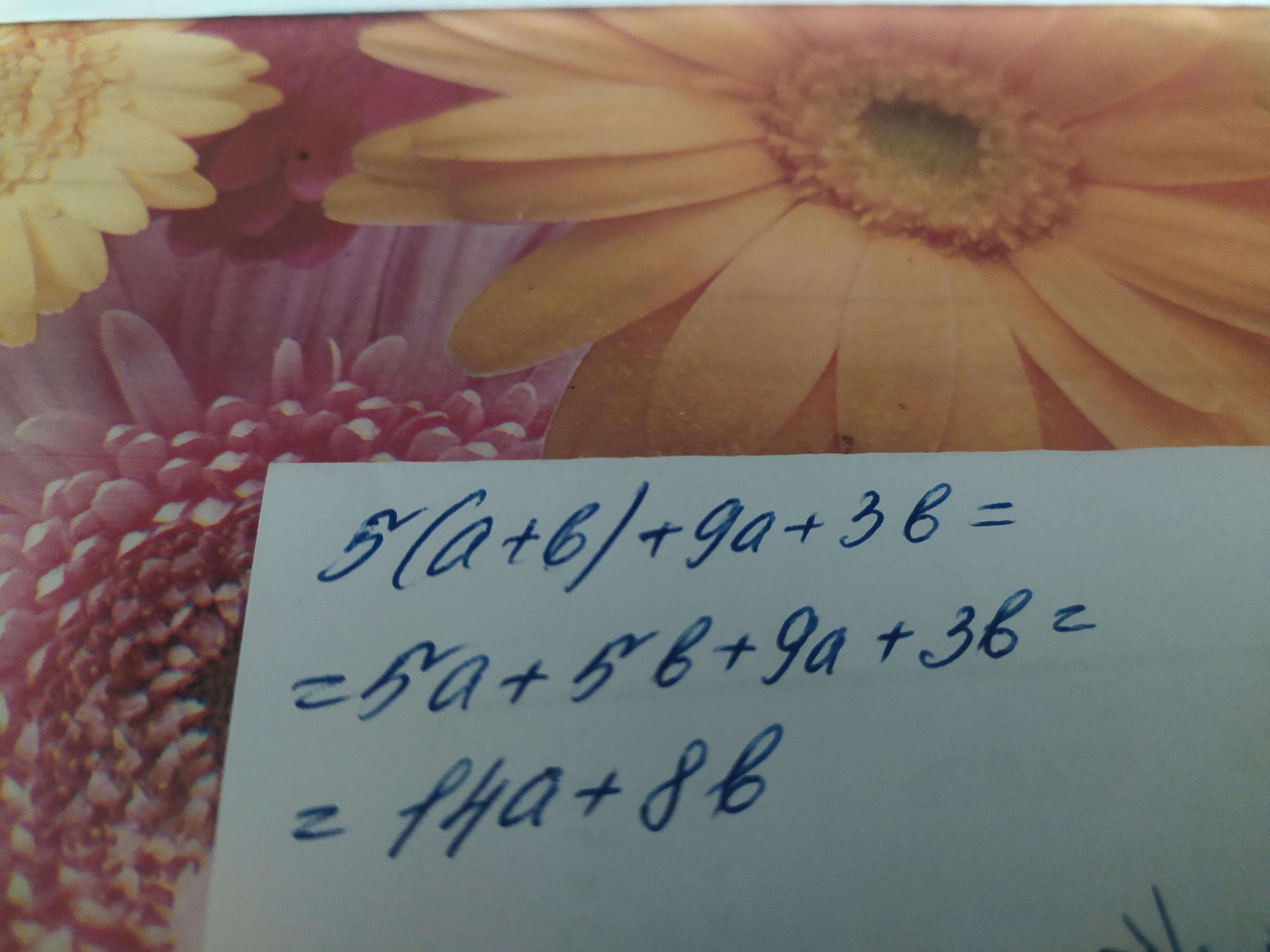 5 · (а + в) + 9а + 3в = 5а + 5в + 9а + 3в = 14а + 8в