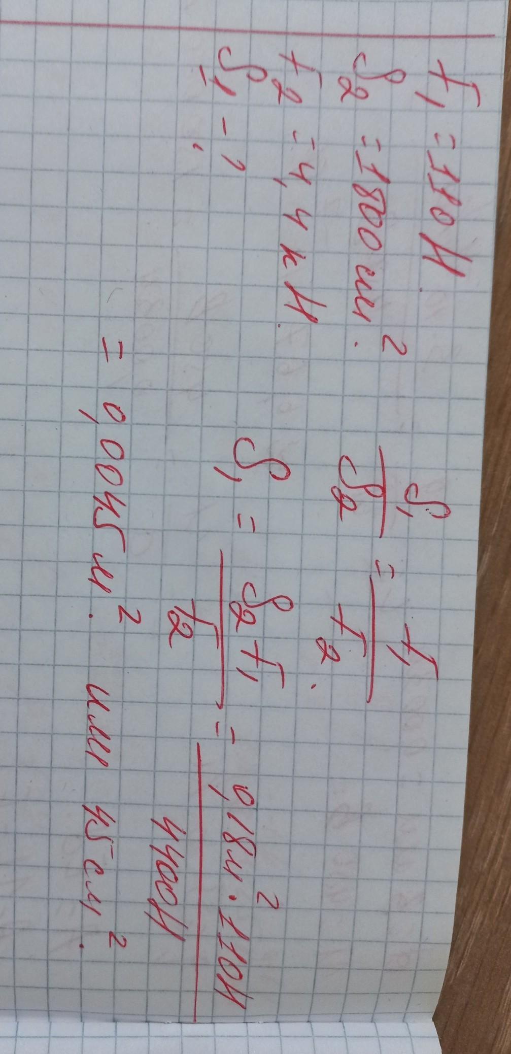 Якщо на менший поршень гідравлічного преса діє сила 110 Н, то на більший поршень площею 1800 см2 передається сила тиску 4,4 кН. Яка площа меншого поршня? Відповідь подати у см2 (запишіть тільки число).