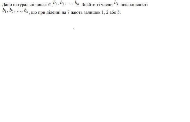 Поможіть задача в C++: Дано натуральні числа n, b1,b2,...,bn. Знайти ті члени bk послідовності b1,b2,...,bn, що при діленні на 7 дають залишок 1,2або5.