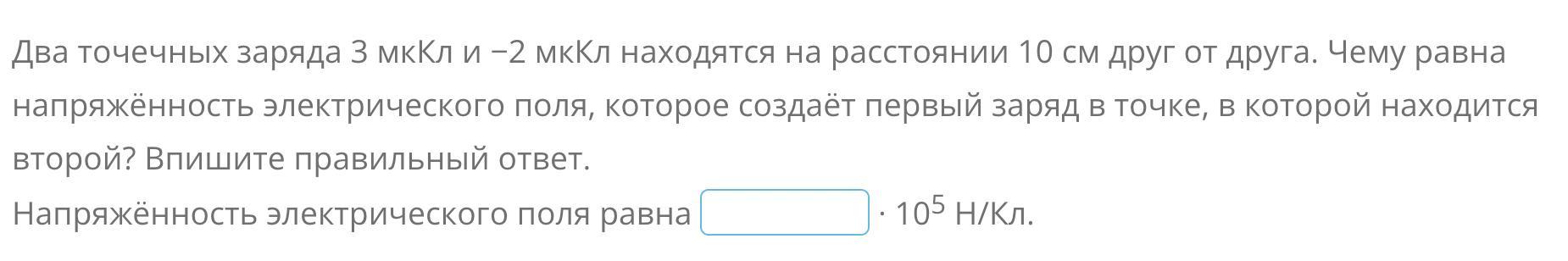Два точечных заряда 3 мкКл и −2 мкКл находятся на расстоянии 10 см друг от друга. Чему равна напряжённость электрического поля, которое создаёт первый заряд в точке, в которой находится второй?