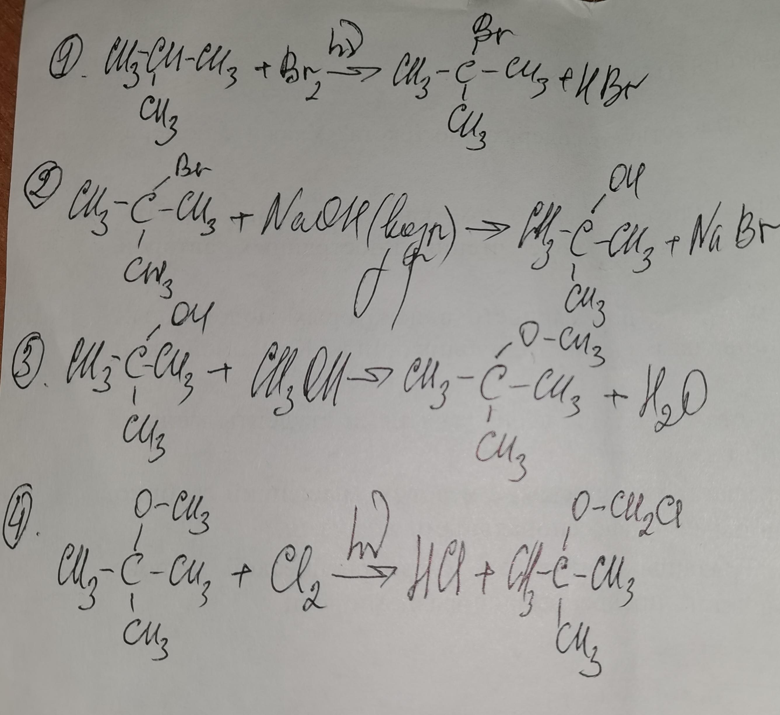 2-метилпропан +Br2-->X1 +NaOH (водн)-->X2 +CH3OH--> X3 +CL2 (hv)--> X4