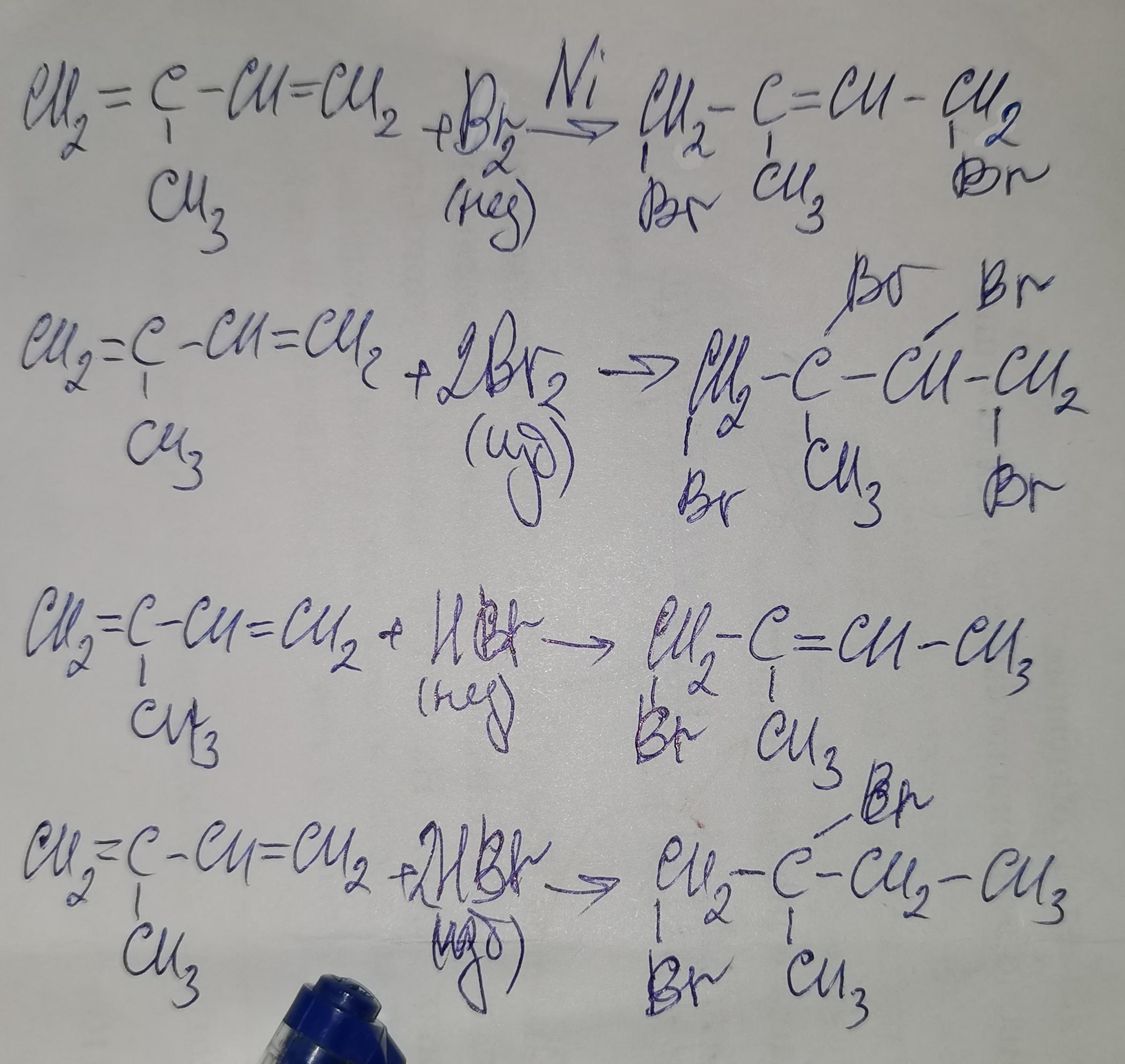 Напишите уравнение реакций присоединения к изопрену брома бромистого водорода, используя различные механизмы реакции. Напишите полученные соединения.