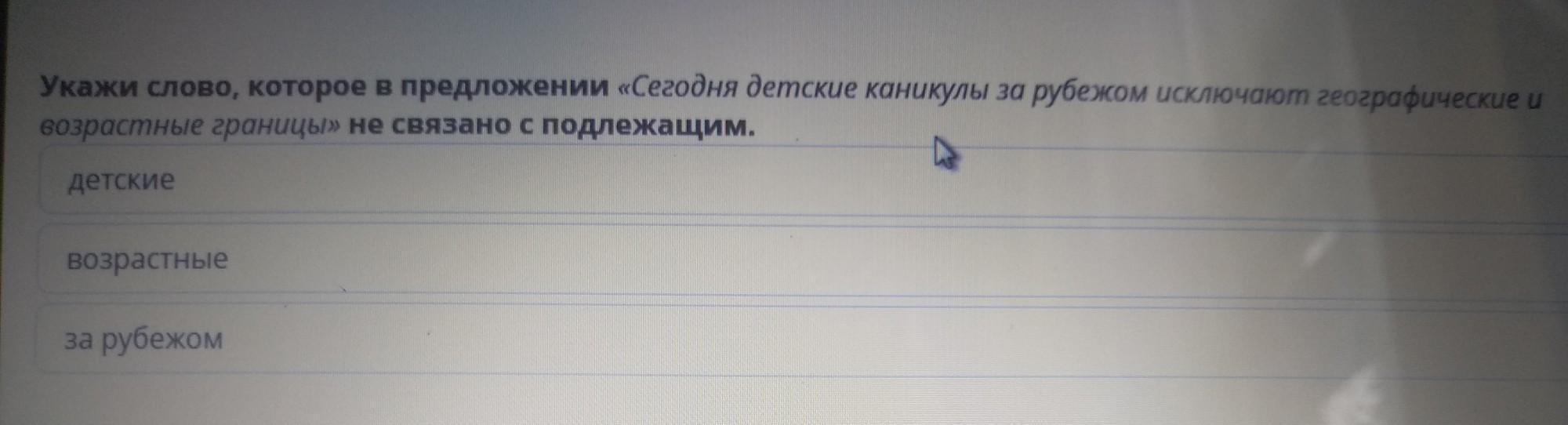 Укажи слов которое "Сегодня детские каникулы за рубежом исключают географические и возрастные границы" не связано с подлежащим.