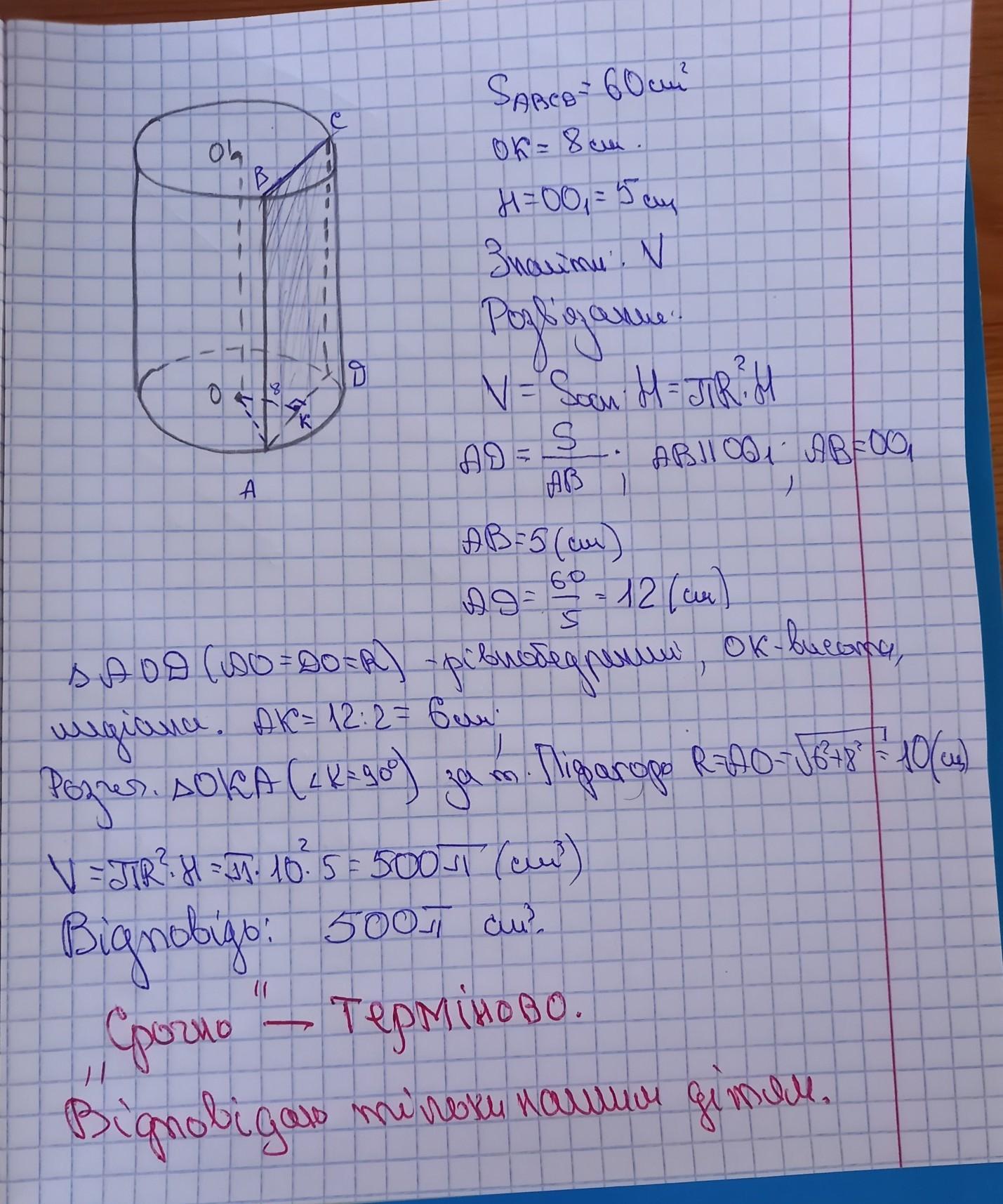 Переріз, паралельний осі циліндра і віддалений від неї на 8 см, має площу 60 см2 . Висота циліндра дорівнює 5 см. Знайдіть об’єм циліндра.