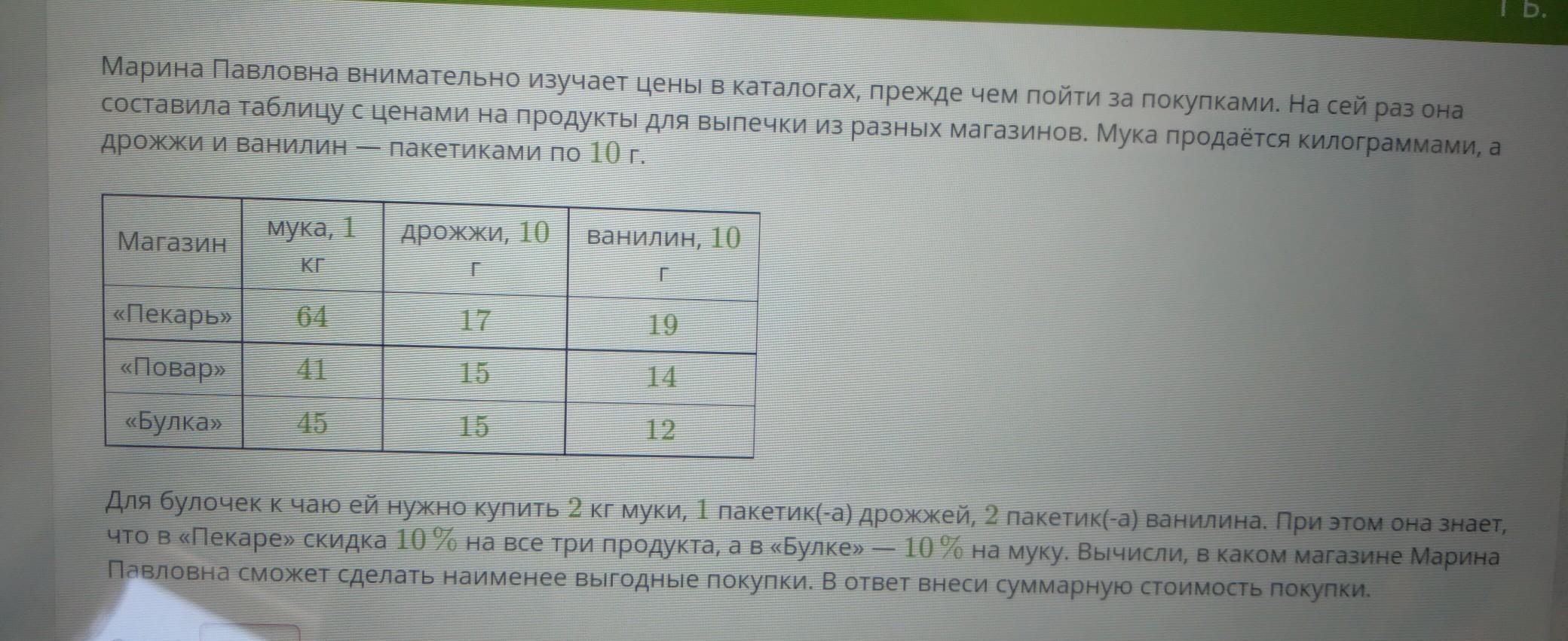 Для булочек к чаю ей нужно купить 2 кг муки, 1 пакетик(-а) дрожжей, 2 пакетик(-а) ванилина. При этом она знает, что в «Пекаре» скидка 10% на все три продукта, а в «Булке» 10% на муку. Вычисли, в каком магазине Марина Павловна сможет сделать наименее выгодные покупки. В ответ Внеси суммарную стоимость покупки. Ответ: руб.