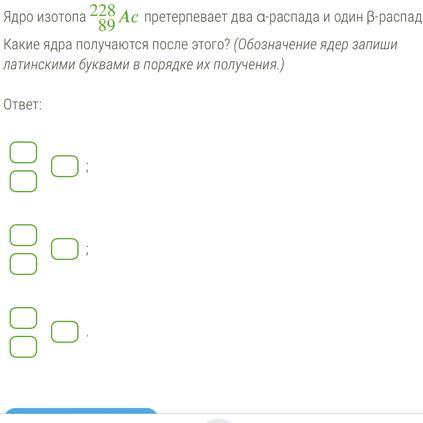 Ядро изотопа 228(верх) 89(низ) претерпевает два α-распада и один β-распад. Какие ядра получаются после этого? (Обозначение ядер запиши латинскими буквами в порядке их получения.)