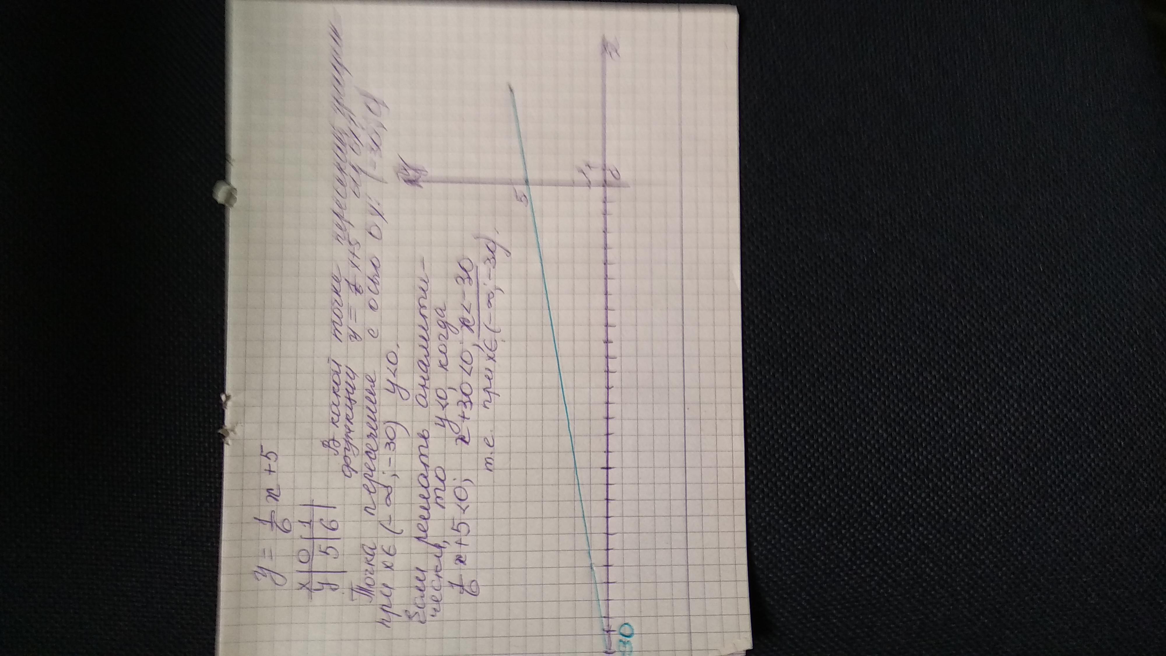 Объяснение: дублирую. Точка пересечения графика у=х/6 и оси ох - точка (-30;0) , см. рис. значит, у<0, при х∈(-∞; -30), если без рисунка решить аналитически ,то х/6+5<0⇒x+30<0; x<-30, рис. во вложении.