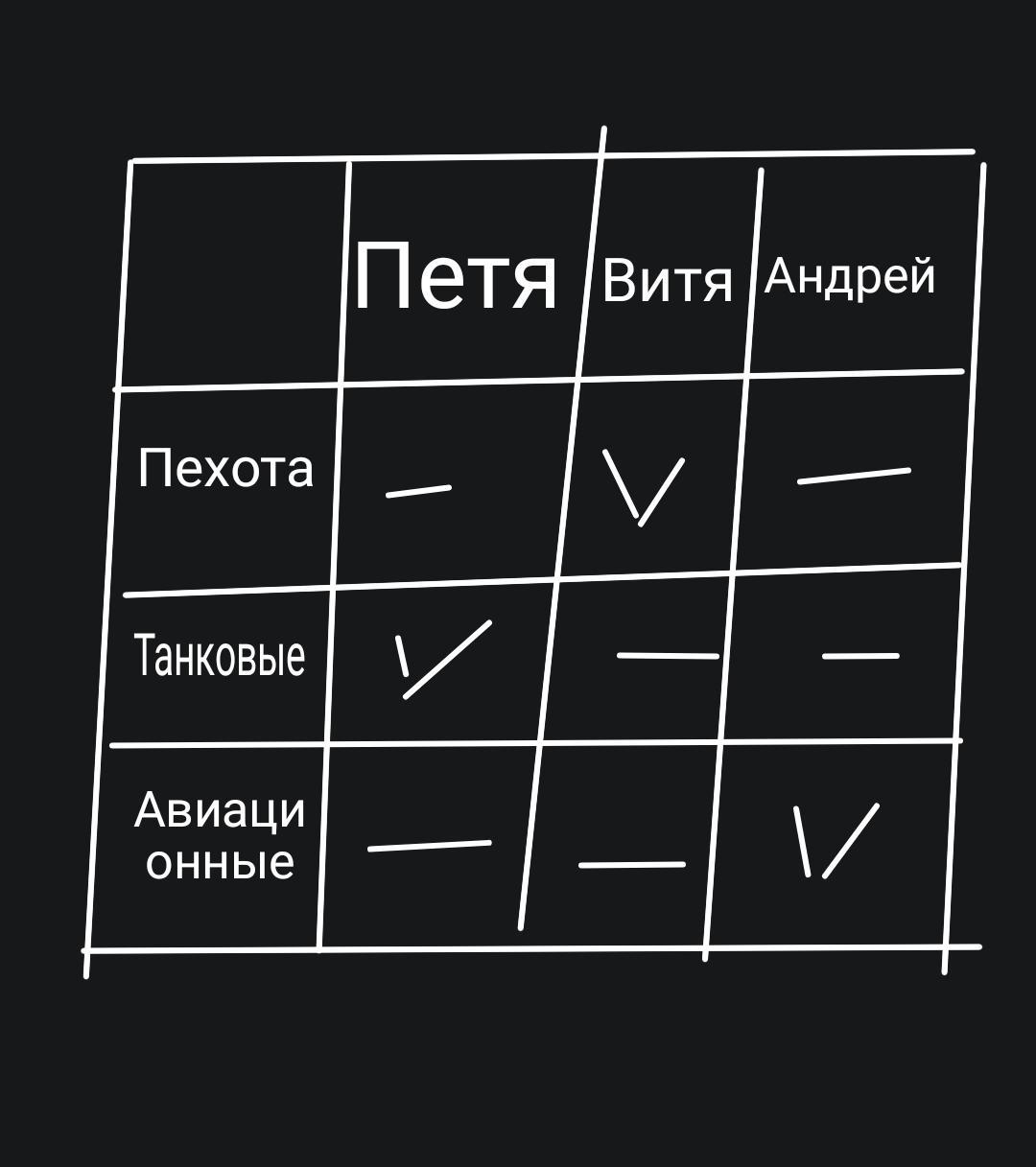 Задача. a Витя, Петя и Андрей служат в разных войсках: один в пехоте, другой - B танковых, третий В авиации. Кто где служит, если известно, что Петя и Витя не служат в авиации, а Андрей и Петя не попали в пехоту?