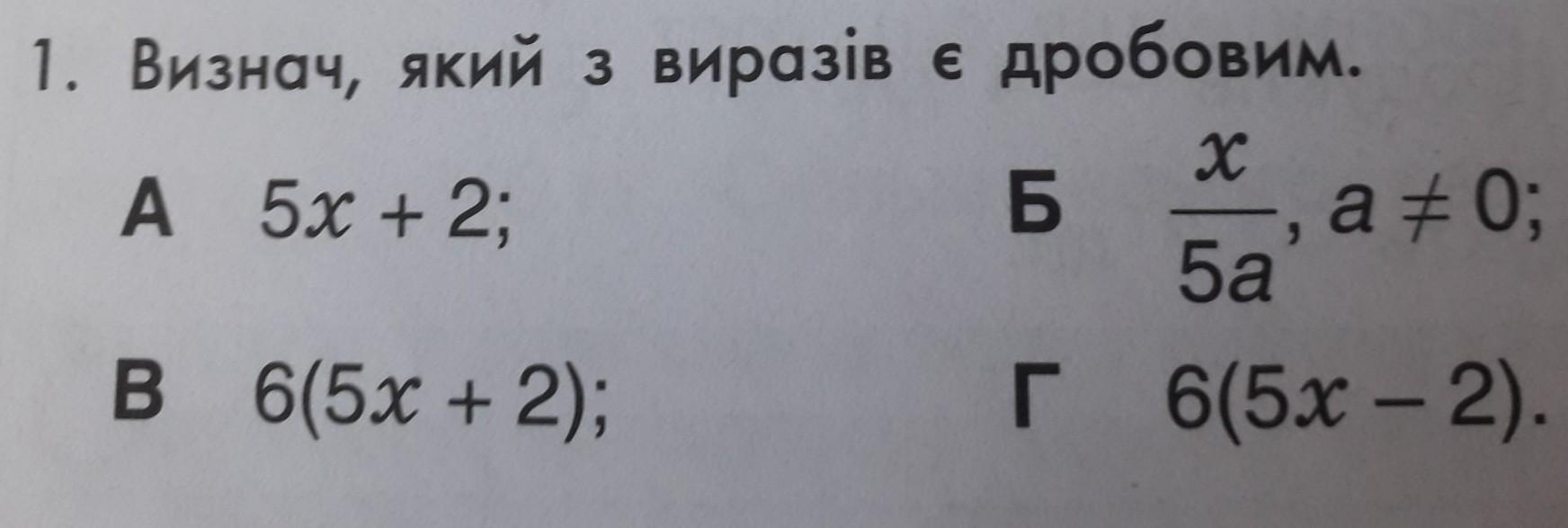 1. Визнач, який з виразів є дробовим. х А 5х + 2; Б 5а в В 6(5х + 2); г 6(5х – 2). 6( , а+ 0: СРОЧНО ЕСЛИ НЕ БКДЕТ МАМА НАБЬЕТ