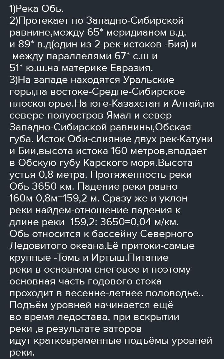 Опишите географическое положение реки Обь. Заполните таблицу.