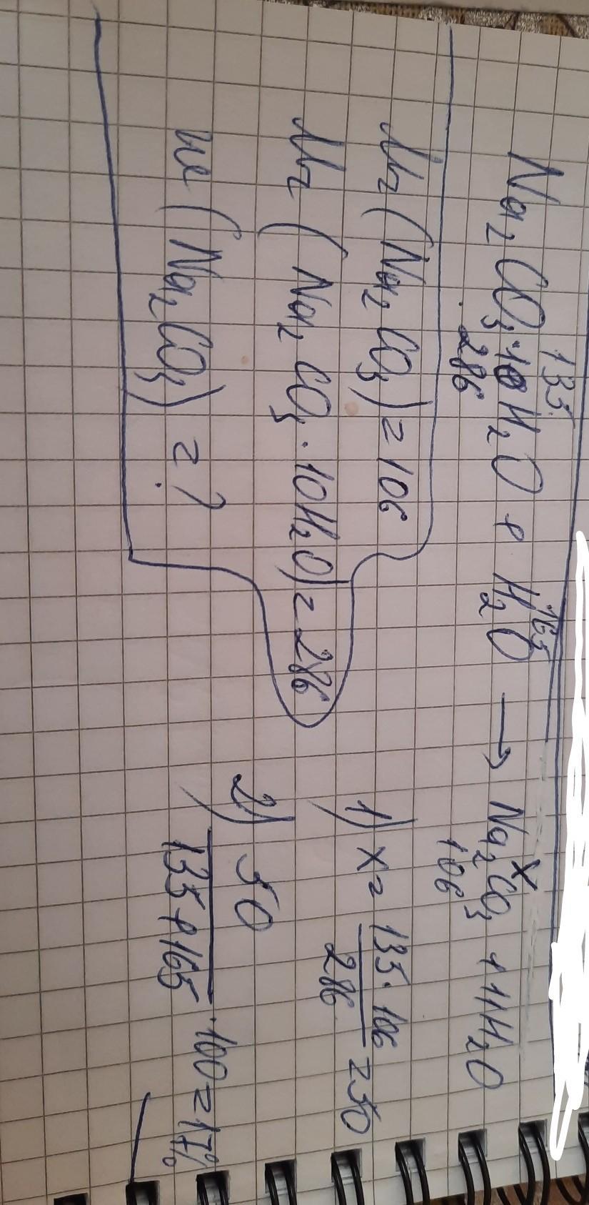 В 165 г воды растворили 135г кристалической соды. Определите массовую долю ( в долях единицы в процентах) безводной соли ( Na2CO3) в полученном растворе.