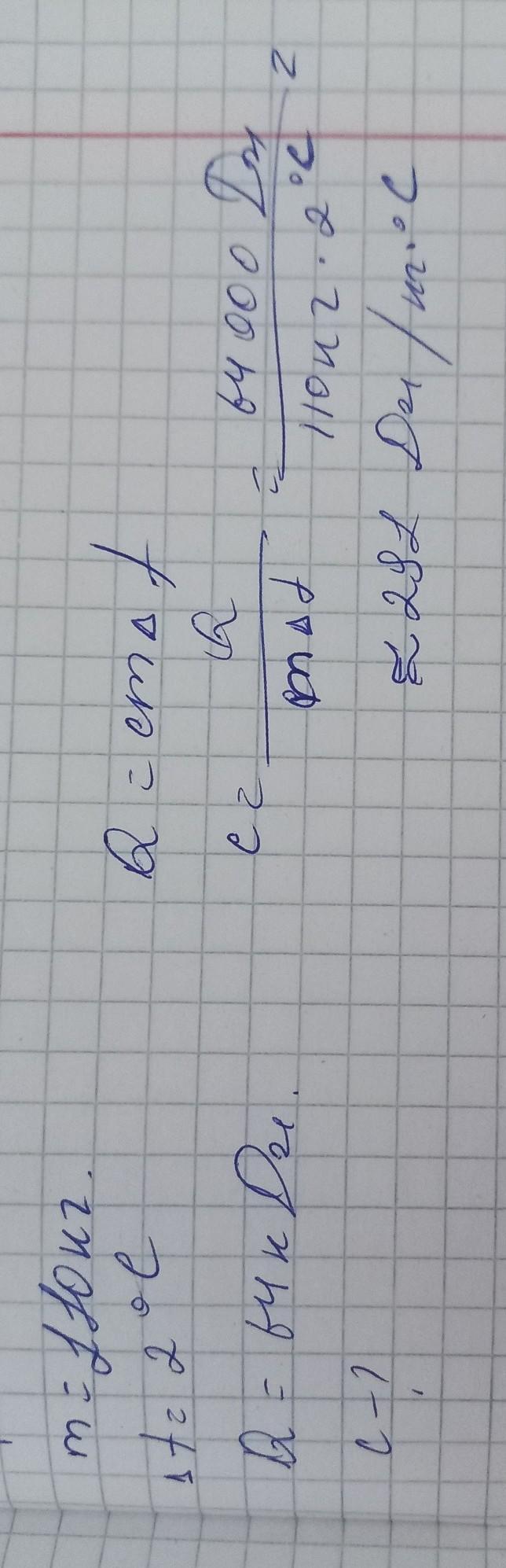 Нагретый камень массой 110 кг, охлаждаясь в воде на 2 0С, передает ей 64 кДж энергии. Чему равна удельная теплоемкость камня?