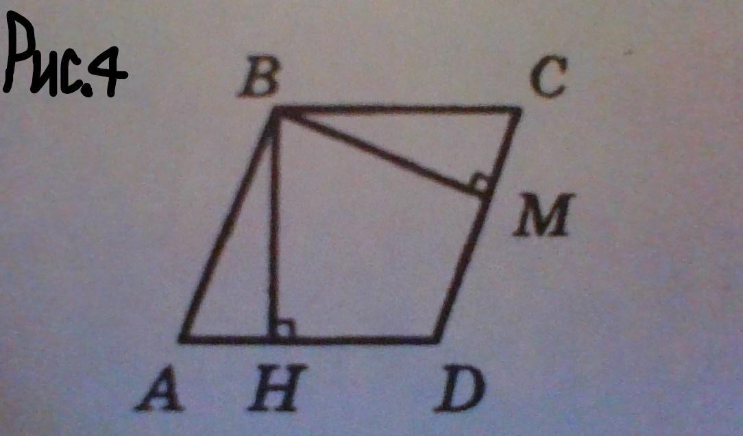 На рисунке 4 изображён параллелограмм ABCD, в нём проведены высоты BH и BM. Найдите подобные треугольники и докажите их подобие.