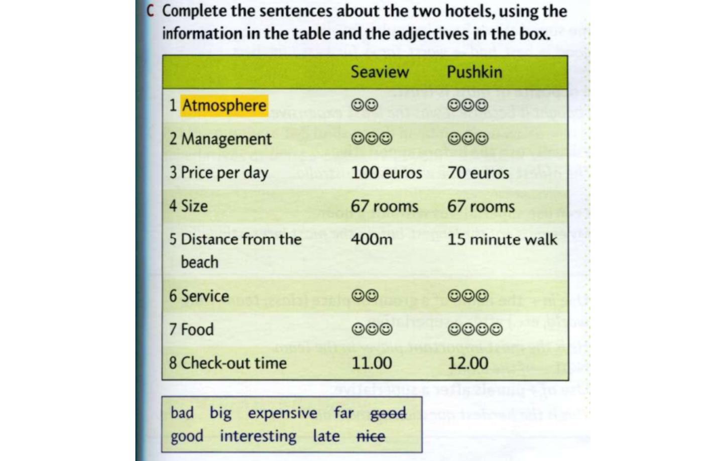 Complete the sentences about the two hotels using the information in the table and the adjectives in the box. СРОООЧНОООО!!!!!!
