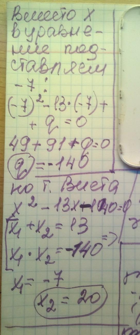 Число -7 является корнем уравнения х^2 -13х+ q=0. Найдите значение q и второй корень уравнения.