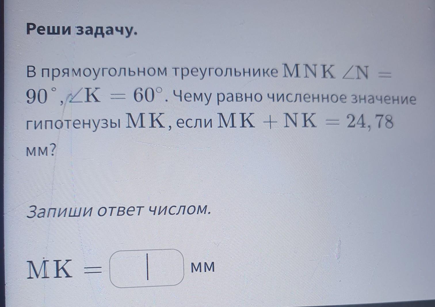 Реши задачу. В прямоугольном треугольнике MNK ZN = 90°, 2K = 60°. Чему равно численное значение гипотенузы МК, если MK + NK = 24, 78 MM? Запиши ответ числом. | MK = MM