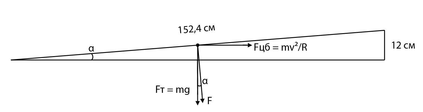 Чтобы колеса поезда не оказывали бокового давления на рельсы, необходимо чтобы результирующая сила шла в направлении, отклонённом от вертикали на угол α (см рисунок).