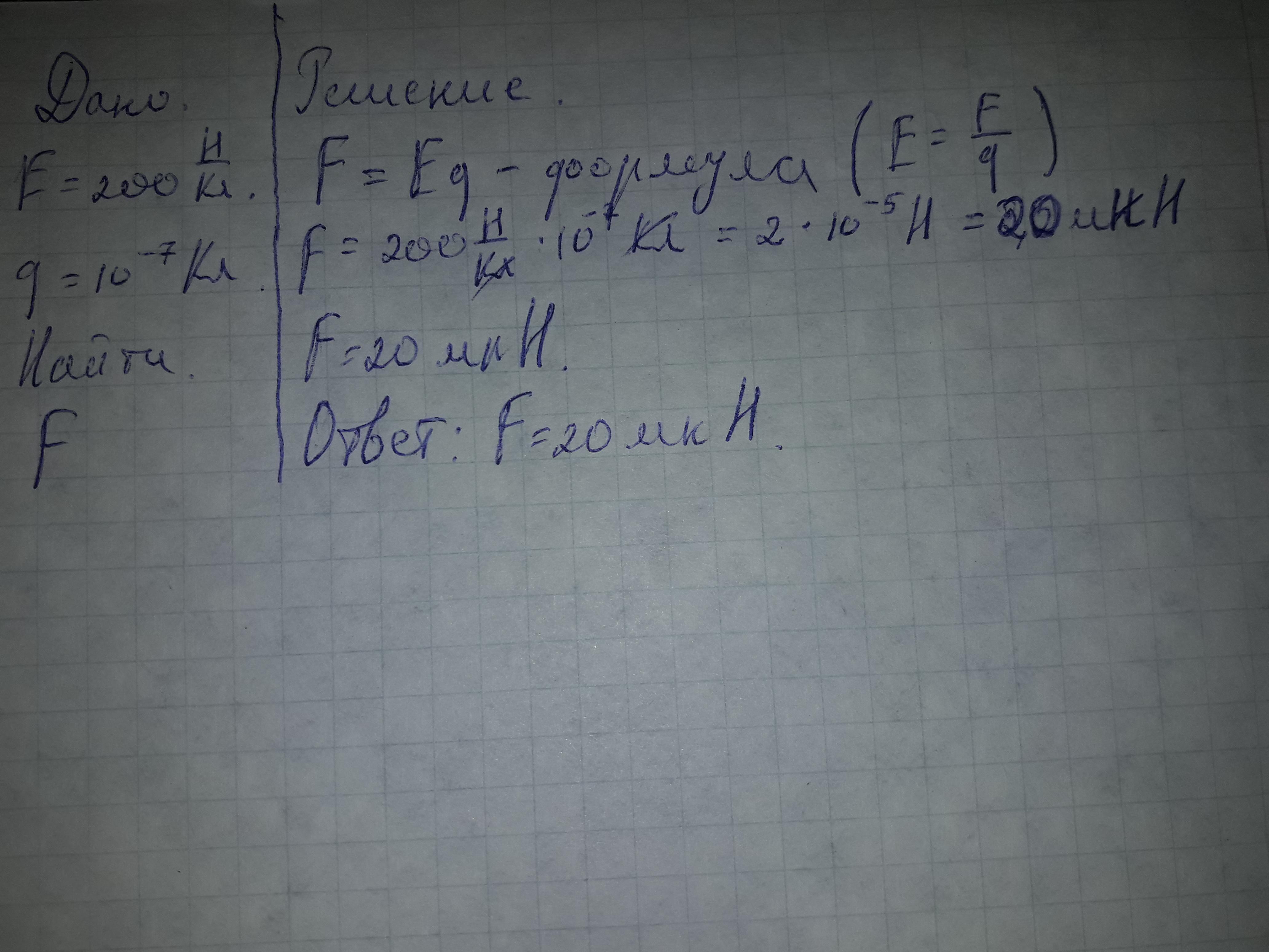 В электрическое поле напряженностью 200 H/Кл в вакууме вносят заряд 10^-7 Кл.Определите силу действия электрического поля на этот заряд