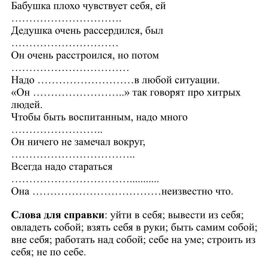 Вставьте на место пропусков один из фразеологизмов с местоимением себя, данных в справке, запишите предложения.