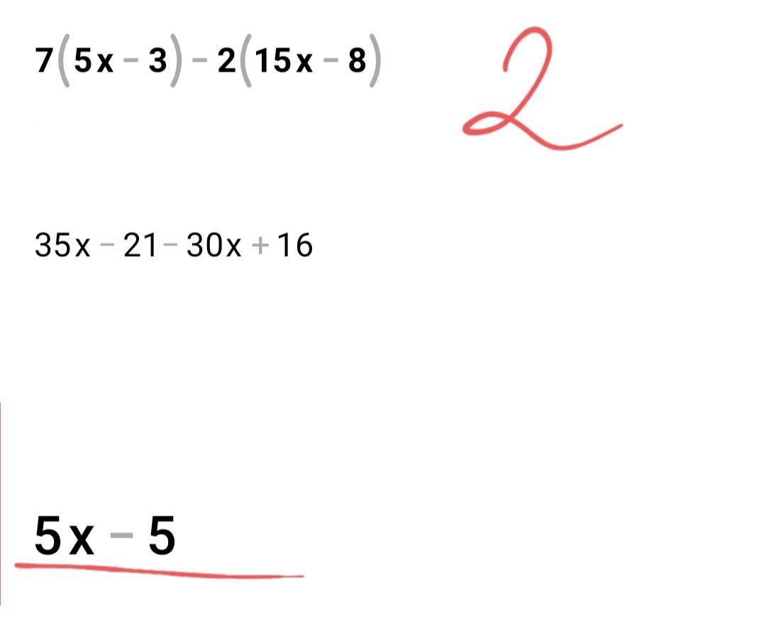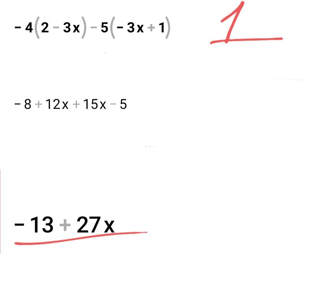 Откройте скобки и проведите подобные члены: 1) -4×(2-3х)-5×(-3х+1);