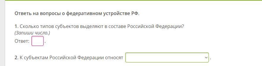 1. Сколько типов субъектов выделяют в составе РФ (запишите число)