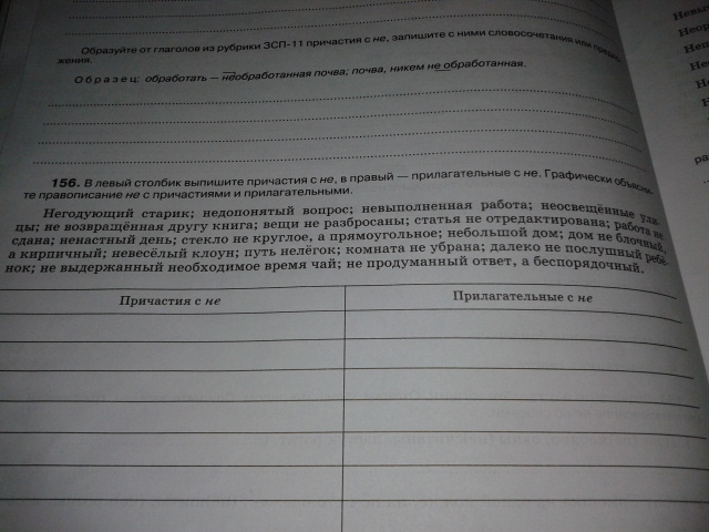 негодующий старик. Недопонятый вопрос. невыполненная работа. неосвещенные улицы. не возвращенная другу книга. вещи не разбросаны. статья не отредактирована. работа не сдана. ненастный день.стекло не круглое а прямоугольное. небольшой дом. дом не блочный а кирпичный. невесёлый клоун. путь нелёгок. комната не убрана. далеко не послушный ребенок. не выдержанный необходимое время чай. не продуманный ответ а беспорядочный.